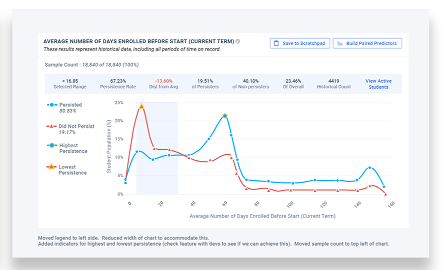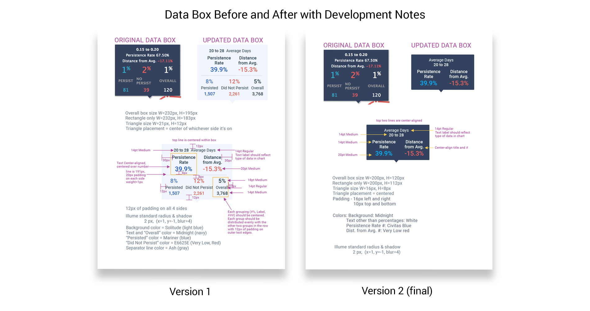 Fortunately, the delay gave us an opportunity to reassess the design before it was implemented. I met with the product manager and senior designer on my team to go over it again, and the designer had recently done research on tooltips. He said that the current best practice was to have a contrasting background to separate the tooltip from the chart. Then, we discussed whether or not all the information from the original box needed to be there. We concluded that the “Persistence Rate” and the “Distance from Average” were the most important pieces of information, and that the number of students was secondary and not required. So, I simplified the contents of the box to show only those components, and adjusted the colors to match our other tooltips, which had a darker color scheme. I was pleased that the smaller box made the darker color seem less heavy than it originally did.