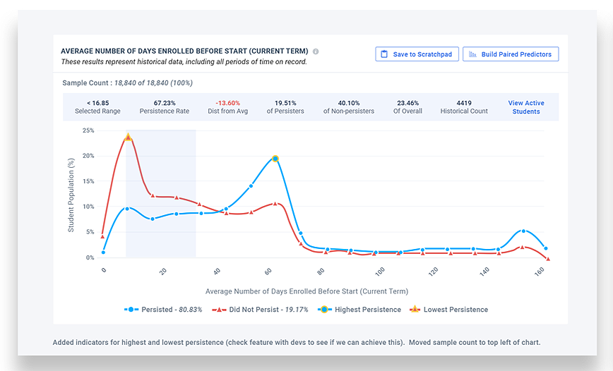 While adjusting the layout of the legend and labels, I designed a new interaction on the chart. Since one of our goals was to get the user to insights more quickly, I felt that it would be beneficial to highlight the points of highest and lowest persistence. After speaking with one of our user education experts who trains new users on the product, he suggested that it was a good idea, but that he didn’t think it was a priority. Our product manager agreed because it added complexity that our development team didn’t have time for, so we didn’t move forward with the idea.