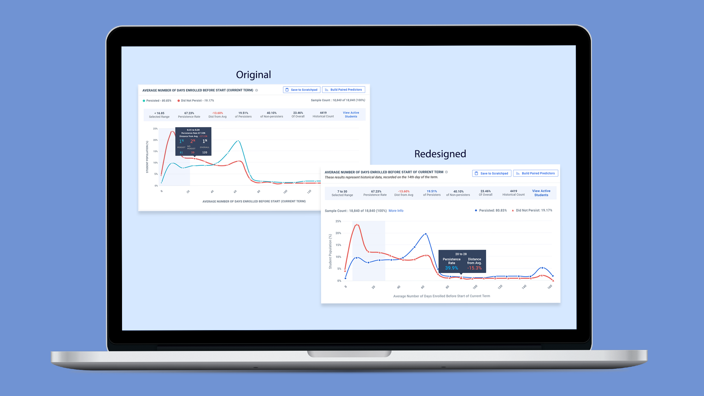 The data box that appeared when individual points were hovered over needed a redesign for color and content, as well, which required collaborating with the product manager to determine which data was the most valuable to our customers so it could be prioritized.
