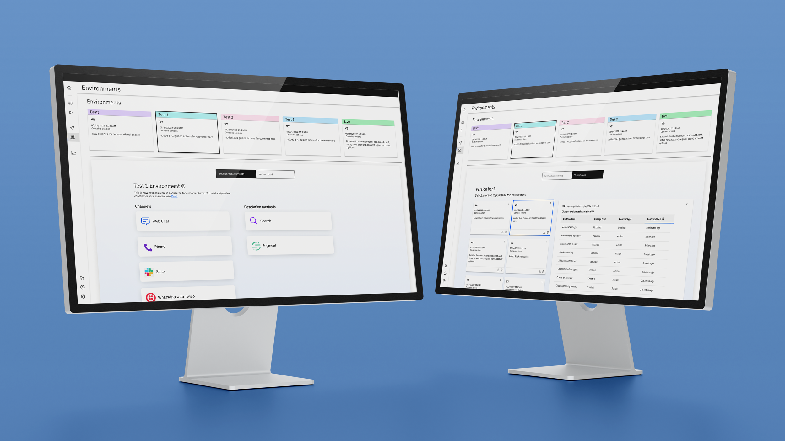 Solution: Following a design thinking workshop to align on concepts, our product team created multiple staging environments (3) which could be added, deleted, and modified. I also established a new design pattern and visual assets for deploying versions of the AI assistant, which had touchpoints throughout the product.